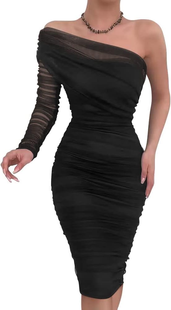 Women's Elegant One Shoulder Sheer Bodycon Ruched Midi Semi Formal Dress