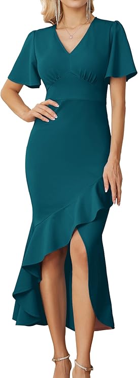 2024 Elegant Ruffle Mermaid Formal Wedding Guest Dress Short Sleeve V-Neck Cocktail Dress for Women Evening Party