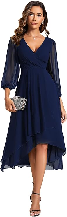Women's Chiffon V Neck Long Sleeves Pleated A-Line Midi Length Wedding Guest Dress 01926