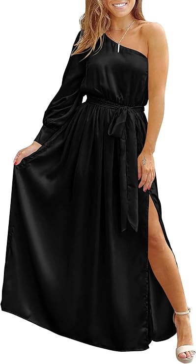 Women's Satin Long Sleeve One Shoulder Maxi Dress Asymmetrical Tie Waist Slit Party Cocktail Long Formal Prom Dress