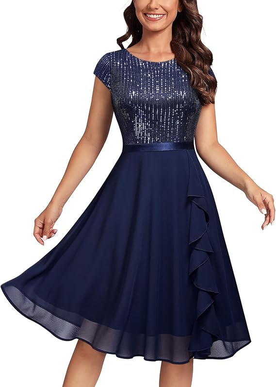 Women's Elegant Glitter Sequin Ruffle Style Cocktail Prom Dress