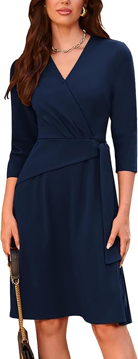 Womens Cocktail Dress Faux Wrap V Neck Pleated 3/4 Sleeve Stretchy Midi A Line Wedding Guest Dress