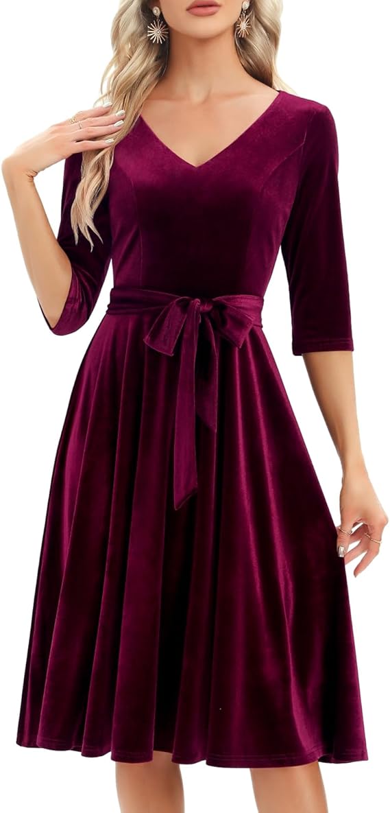 Long Sleeve Velvet Vintage Tea Dress Formal Cocktail Wedding Midi V-Neck Fit and Flare Dresses