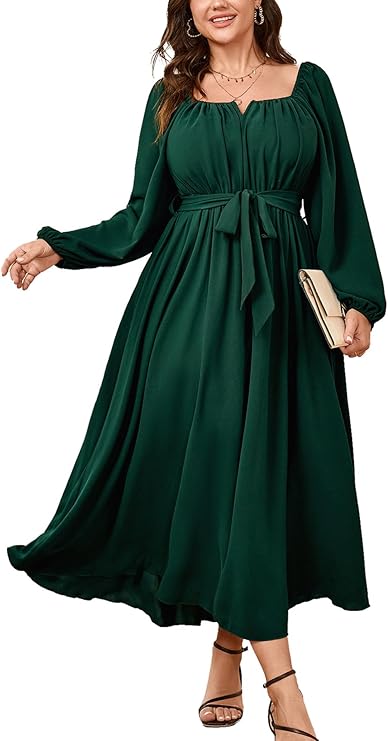 Women Plus Size Maxi Dress Long Sleeve Square Neck Wedding Guest Cocktail Belted Elegant Flowy A Line Long Dresses