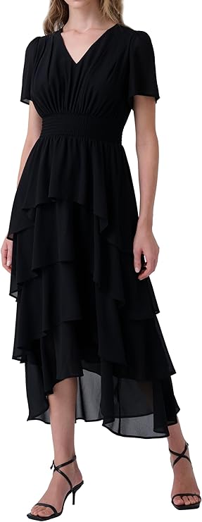 Women's Chiffon Tiered Midi Dress Short Sleeve Layered Flowy Long Dress Smocked Waist Wedding Guest Dresses